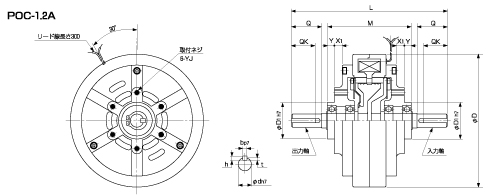 自然冷卻式<POC-1.2A> 形式 POC-1.2A 靜摩擦トルク Nm 12 定格電圧 DC-V 24 消費電力 W(at75℃) 20.4 質(zhì)量 kg 5.5 單位 : mm 徑 方 向 D 152 D1 42 軸 方 向 L 178 M 96 X1 9 Y 8 取 付 YJ P.C.D 64 ネジ M6x13 軸 穴 Q 34.5 QK 27 d 15 b 5 h 5 t 3